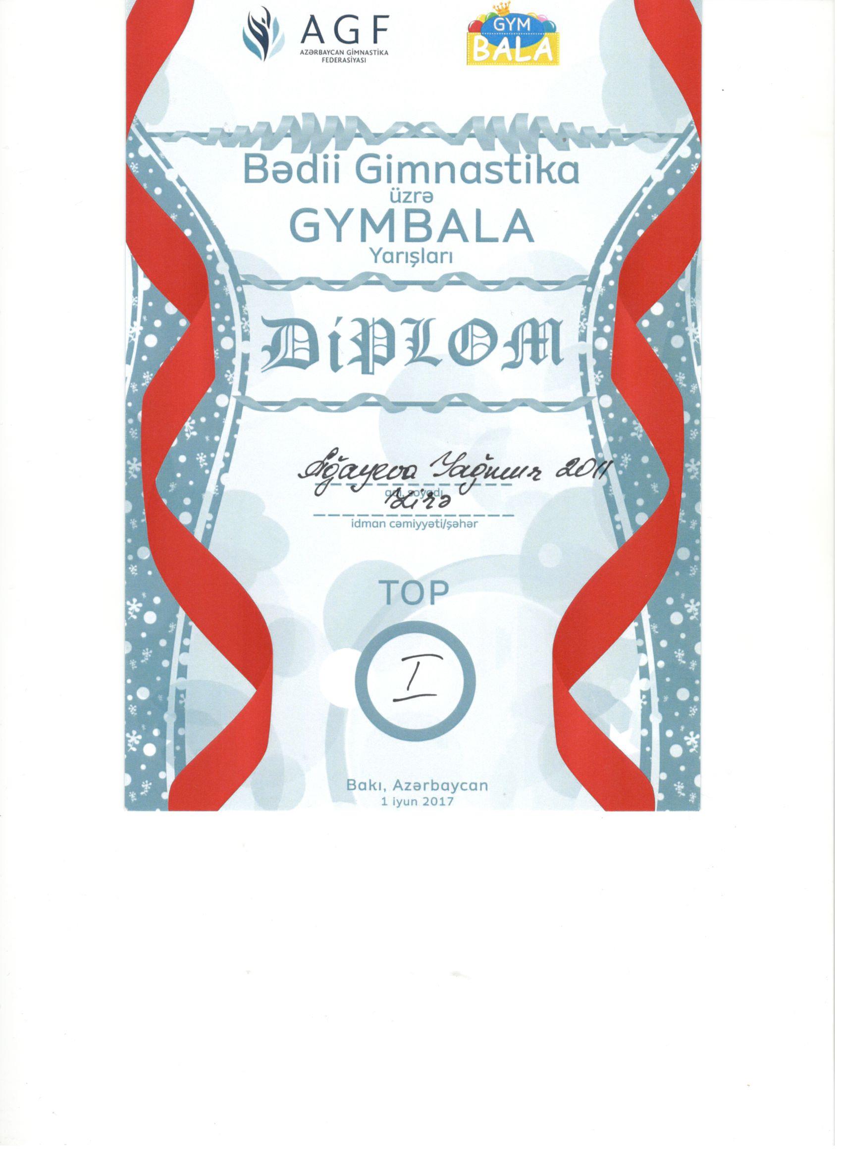 Cabarlı Taclıbəyim alətsiz hərəkətlərdə yarışlarda iştirakına görə diploma laiq görülmüşdür.